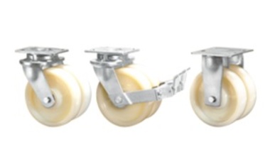 Nylonhjul i svetsad stålbygel med rektangulär fästplatta och dubbelmonteradehjul för låg bygghöjd, lättare svängning och lägre yttryck på underlaget. Enradigt vridningslager med CNC-svarvad härdad kulbana. Tätad och medsmörjnippel. Kulkransen förenar topplattan och gaffeln vilket gör en centrumbult överflödig. Bromsbara länkhjul har en fotbroms som låser hjulet. Gaffelvidd 2x65 mm med 6 mm tjocka gafflar svetsade på både in- och utsida.Axelhål för M12 skruv. Länkbygelns bärighet är 1500 kg.