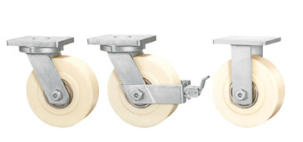 Gjutet polyamidhjul PA6G i svetsad stålbygel med rektangulär fästplatta.Vridningslager med axialkullager DIN711 och underliggande koniskt rullager DIN 720. Tätad och med smörjnippel. Bygelns platta och gaffel sammanfogademed en kraftig och säkrad centrumbult som är integrerad i plattan. Justerbartspel i vridningslagret. Bromsbara länkhjul har en fotbroms som låser hjulet. Gaffelvidd 95 mm med 12 mm tjocka gafflar, svetsade på både in- och utsida.Axelhål för M25 skruv. Länkbygelns bärighet är 5000 kg.