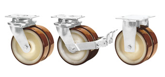 Polyuretanhjul med nylonnav i svetsad stålbygel med rektangulär fästplattaoch dubbelmonterade hjul för låg bygghöjd, lättare svängning och lägreyttryck på underlaget. Enradigt vridningslager med CNC-svarvad härdadkulbana. Tätad och med smörjnippel. Kulkransen förenar topplattan och gaffeln vilket gör en centrumbult överflödig. Bromsbara länkhjul har enfotbroms som låser hjulet. Gaffelvidd 2x65 mm med 6 mm tjocka gafflarsvetsade på både in- och utsida. Axelhål för M12 skruv. Länkbygelns bärighetär 1500 kg.