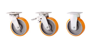 Polyuretanhjul med gjutjärnsnav i svetsad stålbygel med rektangulärfästplatta. Vridningslager med axialkullager DIN 711 och underliggande konisktrullager DIN 720. Tätad och med smörjnippel. Bygelns platta och gaffel sammanfogade med en kraftig och säkrad centrumbult som är integrerad iplattan. Justerbart spel i vridningslagret. Bromsbara länkhjul har en fotbromssom låser hjul och vridning samtidigt. Gaffelvidd 65 mm med 6 mm tjockagaff lar, svetsade på både in- och utsida. Axelhål för M12 skruv. Länkbygelnsbärighet är 1500 kg.