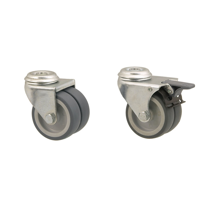 Dubbelmonterade hjul med glidlagrat polypropylennav och grå termoplastiskgummibana i en plåtpressad bygel med fästhål för centrumskruv. Dubbelmonterade hjul ger låg bygghöjd, lättare svängning och lägre yttryckpå underlaget. Tvåradigt vridningslager. Bygelns platta och gaffel sammanfogade med centrumnit. Bromsbara länkhjul har en fotbroms somlåser hjul och vridning samtidigt.