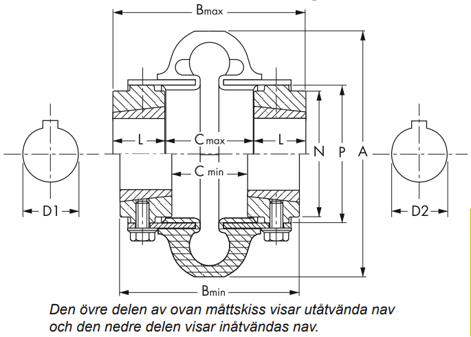 | Artikelnummer | Klämbussning storlek | A mm | B min mm | B max mm | C min mm | C max mm | L mm | N mm | J kgm² | N mm | Klämbussning storlek | Vikt kg | Nominellt vridmoment Mvnom Nm | Max vridmoment Mvmax Nm |
