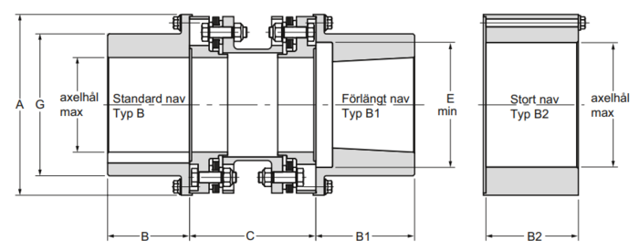 | Artikelnummer | C min mm | Vridmoment nominellt Mvnom Nm | Vridmoment max Mvmax Nm | Max varvtal n r/min | G mm | Axelhål max mm | Varvtal (1) n balanserad | B1 mm | B2 mm | E max mm | Axiell kapacitet kN | ▲ m per m av C kg/m | ▲ J per m av C kgm²/m | Vikt kg | a mm | b mm |